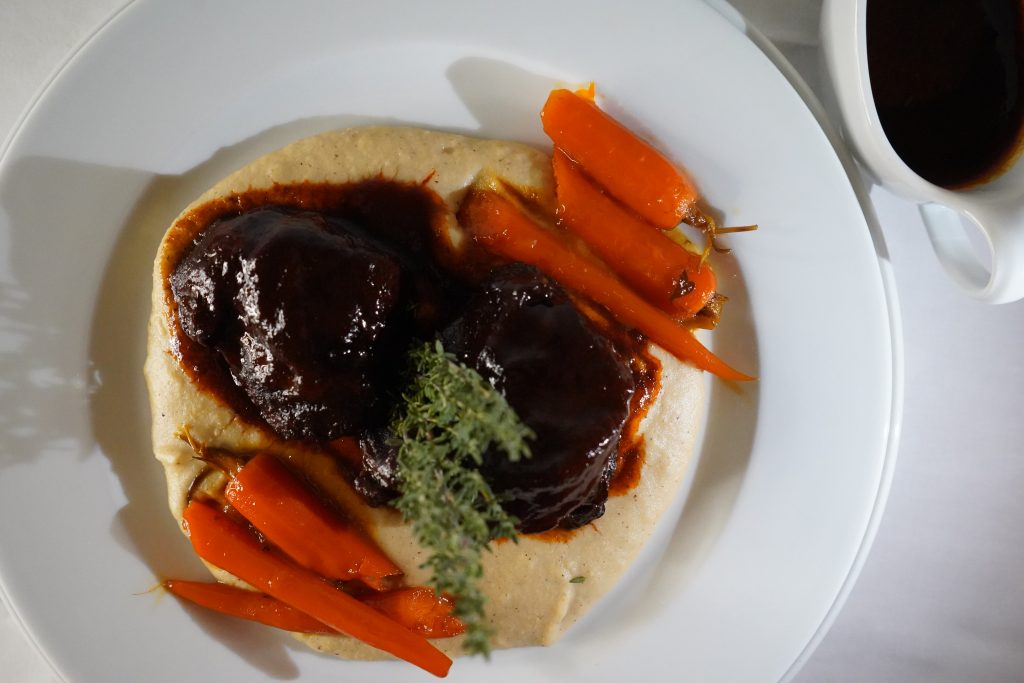 Bierschnitzel mit Kartoffellaibchen und gegrilltem Gemüse